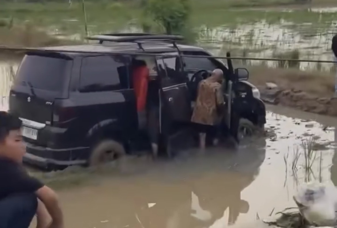 Peristiwa yang terjadi sekitar pukul 17:00 WIB ini sontak menarik perhatian pengguna jalan dan warga setempat. Berdasarkan rekaman video yang beredar, posisi mobil tampak miring dan tertanam cukup dalam di tanah sawah yang berlumpur.